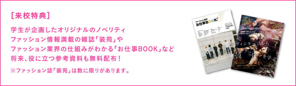当日、校舎入口の総合案内にてイベントパンフレット、ファッションショー整理券を配布します。