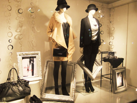 マネキンを2体用いてスタイリングを際立たせるディスプレイにする。コーディネートポイントのモノトーン配色や、白と黒のコントラストを引き立たせるために、白い空間の中に額縁やハイチェアなどをモノトーンで統一し、シンプルでまとまりのある演出としている。