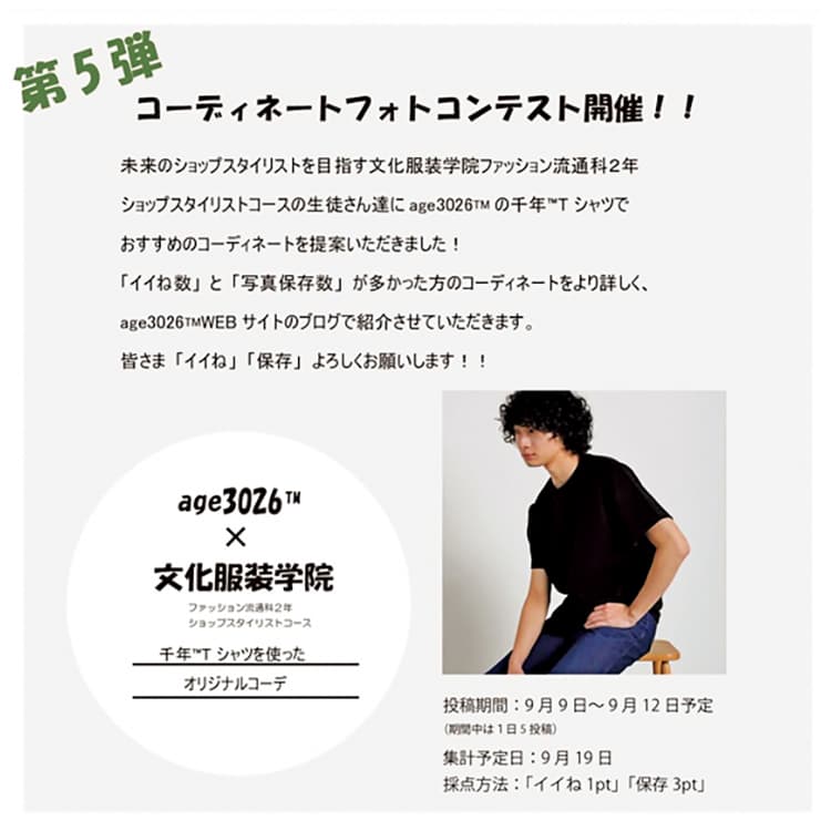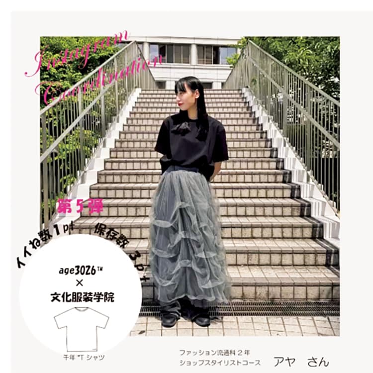 オンライン接客応対スキルの授業と連動し、三菱ケミカル株式会社が手がける繊維「ソアロン™」の公式アパレルブランド「age3026™」のロングシャツを使ったコーディネート提案を実施。age3026™のインスタグラムにてコーディネートが投稿され、いいね!と保存数の多かった学生はWebサイトでも大きく紹介されました。