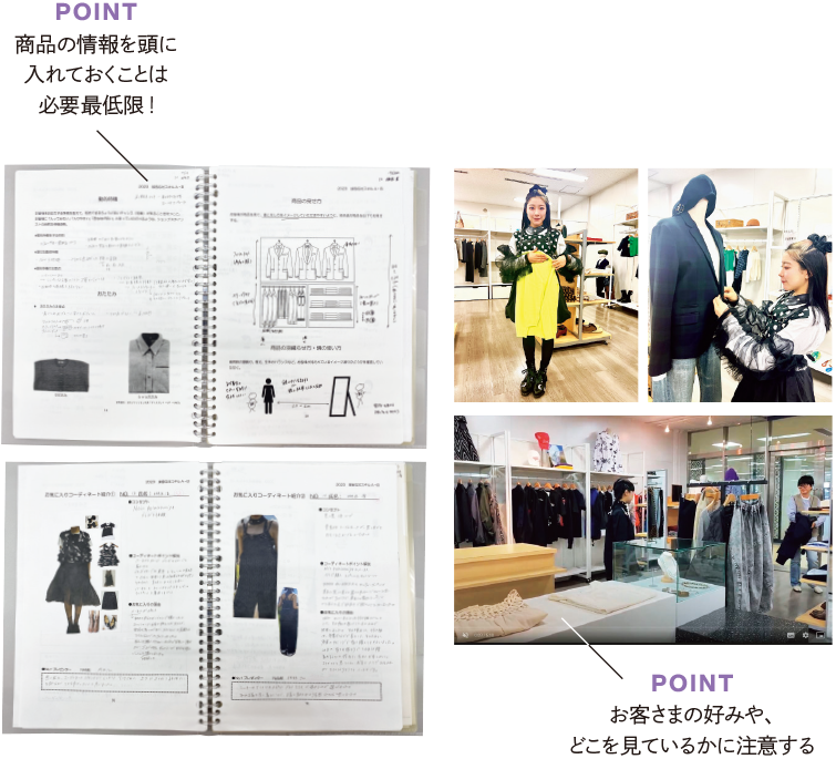 「接客対応スキル」の授業では、接客におけるマインドや言葉遣いなどに加え、自分なりに必要だと感じたポイントをノートに書き留めるようにしていました。ほかの人の目線で考えるという、ショップスタイリストとして大切なことに気づかされることがたくさんありました。