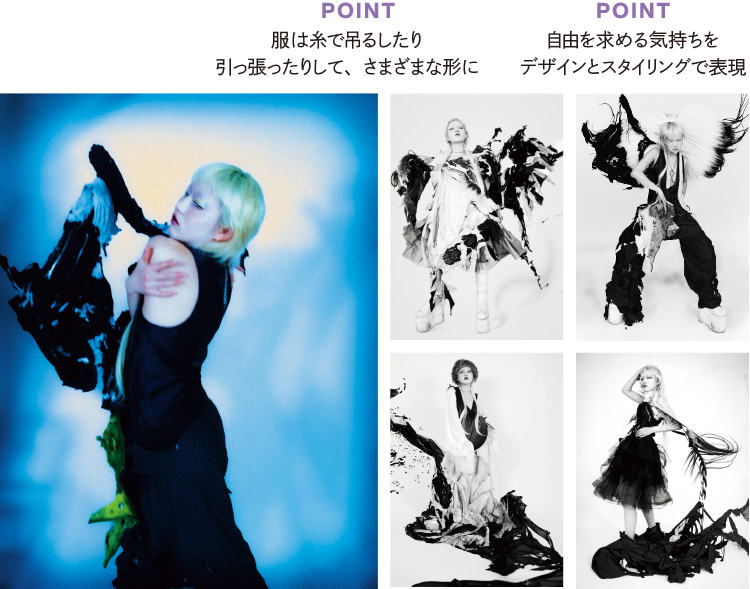 「明晰夢」というコンセプトで、文化服装学院で学ぶ中で経験した夢のような現実を自分らしく表現。過去に使ったアイテムを取り入れながら、思い出と未来への期待を込めた作品を制作しました。カメラやメイク、衣装リースなど、協力していただいた方と一緒にできたことが財産に。