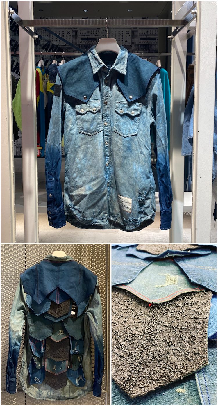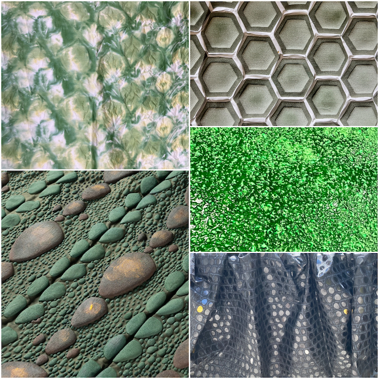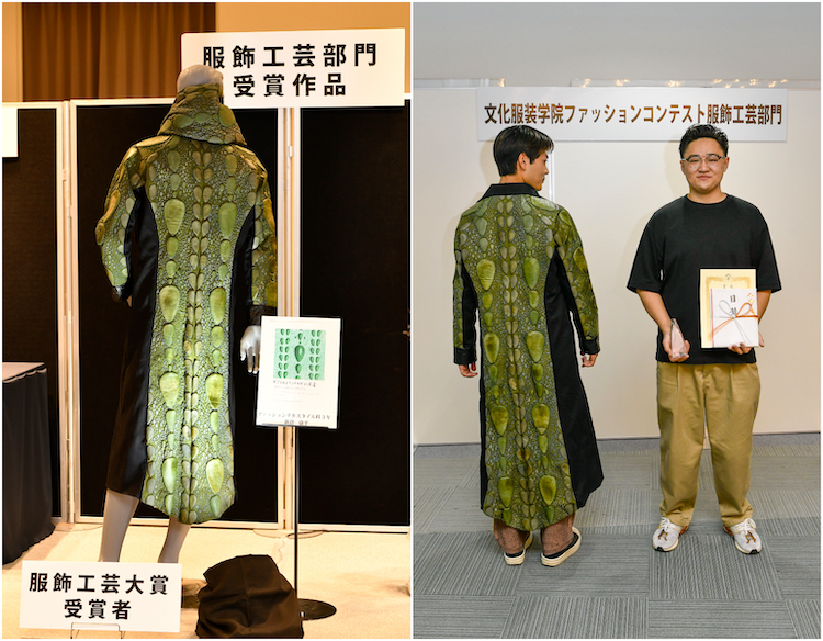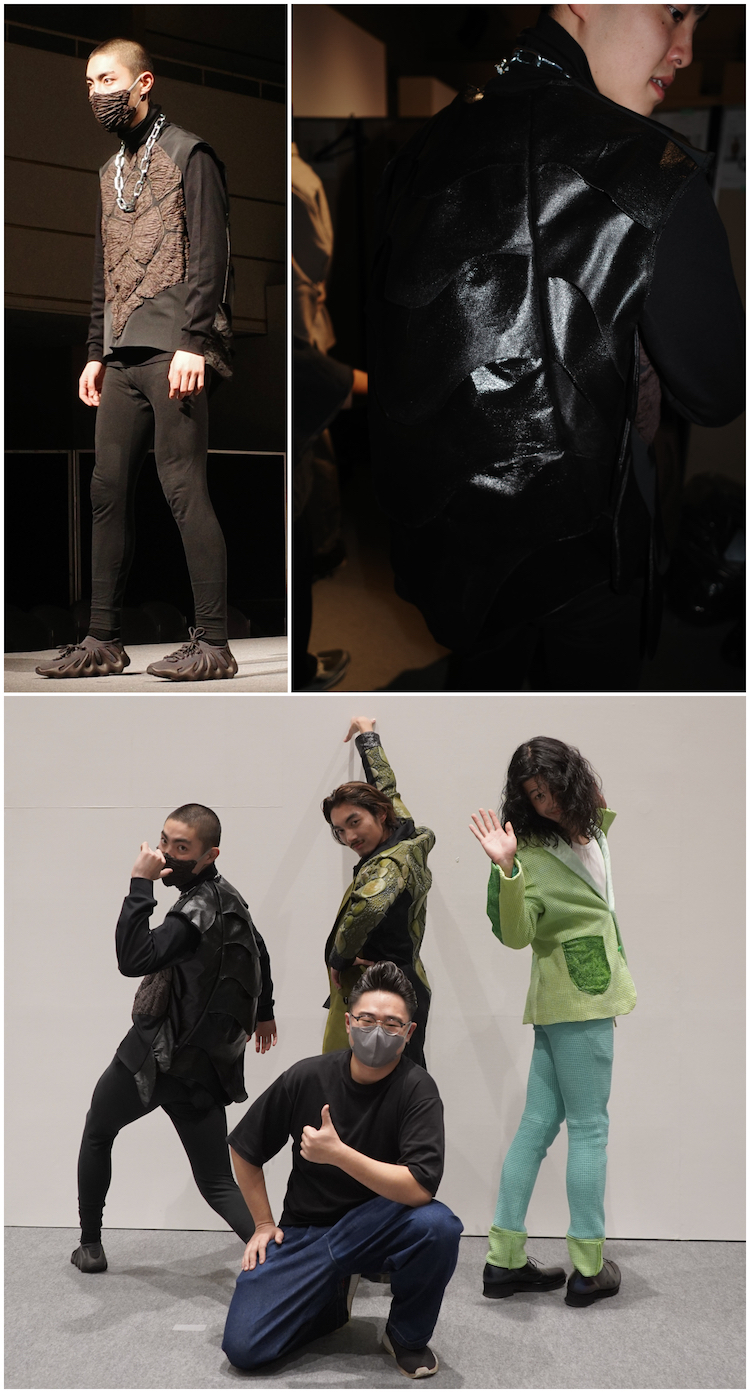 在学中は、テキスタイルの開発に力を入れ、いろいろなコンテストやコラボレーションに挑戦しました。2年次の「テキスタイルクリエイション」の授業では、爬虫類(カイマントカゲ)の皮膚にインスピレーションを受け、発泡プリントを駆使して凹凸のあるテキスタイルを制作。スクリーンを3つの版に分けてプリントし、大きなパーツは5度ほどプリントを重ねました。学校の捺染台を使い、プリントだけで10日ほどかかったと記憶しています。膨らんでいるパーツにはスポンジブラシで明るい色を乗せ、樹脂コーティングをした上で最後に熱を加え、ツヤ感を出してトカゲの皮膚っぽさを演出するなど、細部にまでこだわって仕上げました。このテキスタイルにさらに改善を加えたものをジャパンテキスタイルコンテストに出品し、学生の部で佳作にあたる「シーズ賞」をいただきました!