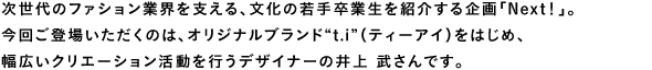 2008年からは自身のクリエーションを、ブランド“t.i”として発表している井上さん。「自分の趣味を突き詰めたキワモノだったりするので、バイヤーさん受けは決してよくないです(笑)。でも、スタイリストさんからの問い合わせは多く、t.iの服が雑誌『装苑』に載ったときは、それを見たスタイリストの岡田さん*が気に入ってくださって、映画『曲がれ!スプーン』の衣装に使われたという経緯もあります。t.iはデザイナーというよりも作家的な活動の場なので、展示会やコレクションを絶対しなきゃいけないというルールもないですし、自分たちの好きなことができればいいかなと思っています」