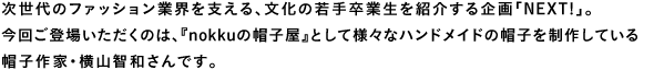 帽子作家として日々帽子制作をこなしている“nokkuの帽子屋”こと横山さん。帽子作家になるからには、もともと帽子が好きだったのだろうか。「小さい頃から帽子を被るのが習慣にはありました。ハットやハンチングなど。でも今は自分の帽子は2つくらいしか持っていませんね」。文化に通いながら帽子作りのノウハウを習得していったのかと思いきや、実はそういうわけでもなかったようだ。「文化に入る前から帽子をやりたかったんですけど、実際は文化では帽子専門というよりもバッグや手芸、刺しゅうなど、総合的に帽子に必要なことを学びました。」。文化では帽子作りの基礎を学び、さまざまな知識と技術を身につけていったようだ。しかし今もまだまだ勉強中なのだとか。