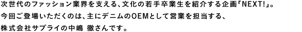 デニムのOEMを請け負う会社で営業として働いている中嶋さん。そもそもOEMとは『相手先ブランド生産』ということである。具体的にはどんな仕事なのかと言うと「簡単に説明すると、自社ブランドを持っているのではなく、取引先のメーカーさんがデザインしたものを形にする仕事です」。取引先メーカーから依頼された漠然としたデザインイメージを形にするべく、メーカーと製造工場との間に入り、イメージに沿った製品を作り上げる。生地から縫製、糸の種類、釦などの付属品を決めて、ある程度の物が出来上がったら、二次加工と言われる段階に入る。加工工場に持っていき、デザイナーのイメージに合う加工を施し、第一段階で上がったものを提出。そこで納得するか修正するかによってサンプルを繰り返し展示会へ、という流れだ。