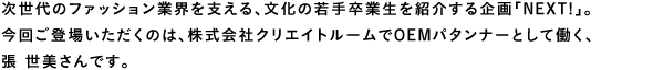 次世代のファション業界を支える、文化の若手卒業生を紹介する企画「Next!」。今回ご登場いただくのは、株式会社クリエイトルームでOEMパタンナーとして働く、張 世美さんです。