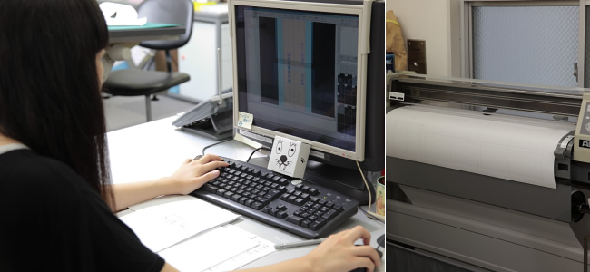 指示書を見ながらCADでパターンを起こす。CADで作成されたパターンは写真右のプロッターで印刷される。
