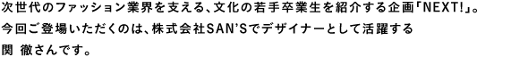 関さんからご紹介いただいた次回のNext!は石川 香代子さん。文化在学中のクラスメイトだった石川さんとは、ブランドのカタログでスタイリングをお願いしていることもあり、仕事においても良き理解者のよう。