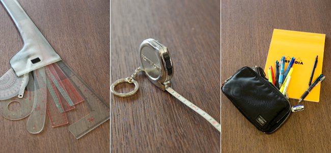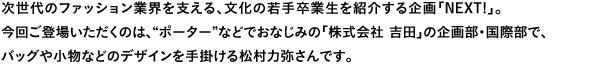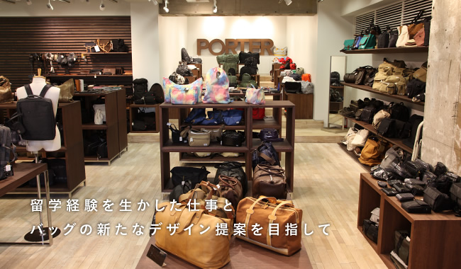 1935年の創業以来、多くのファンを増やし続けている株式会社 吉田。"ポーター"や"ラゲッジ レーベル"のバッグや小物類は国内外で絶大な人気を博している。その商品のデザインを手掛ける松村さんは、企画部・国際部に属し、幅広い仕事を手掛けている。「主な仕事の内容は、年2回の展示会へ向けての商品企画です。ほかにも、海外のショップと別注アイテムを作る場合のやりとりや、通訳を必要とする仕事のときなどにも関わります」。ロンドンでの留学時に、企画部で英語を話せる人材を募集していた同社に応募し、見事採用が決まった。入社後、留学経験は大いに役立ったという。しかし、文化時代からロンドンの留学時に学んだのはレディースの服作り。バッグを専門的に学んだこともなく、入社当時はかなり大変だったそうだ。