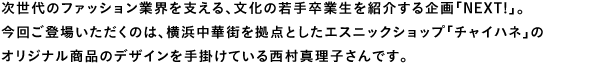 ロンドンでフリーで活動していくこともおもしろいと感じたが、企業で働いてみようと思い帰国。そして現在勤めているアミナコレクションに入社。この会社を選んだ決め手は、「選考基準が日常会話の英語が話せることだったので、語学力を活かせると思ったんです」。海外の取引先と繋がっているということも、働きたいと思った理由だという。今ではシーズンごとにインドやタイ、インドネシアなどの現地へ足を運び、デザインについてのやりとりをしている。西村さんは横浜出身なので、小さい頃からチャイハネにはよく来ていたそう。「それにもともとアフリカンなテイストが好きだったのもあったし、刺繍も好きなので、この会社でやってみようと思いました」