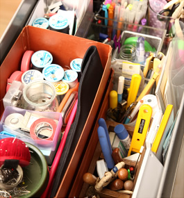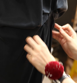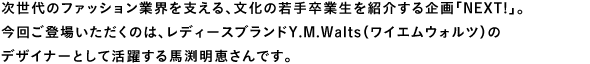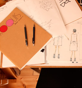 2009年春夏コレクションより、自身のブランドを立ち上げた馬渕さん。現在は生産管理担当と、PRツールなどのビジュアル面を担当する2名のスタッフとともにブランドを運営している。シーズンコレクション前はテーマやイメージについて3人で話し合うが、その後は完全な分担制。展示会に間に合うように、各自が責任を持って作業を進めていく。「スタッフ同士フォローし合えない関係にすることで、責任は重くなりますが、そのぶんやりがいも大きくなると感じています。みんなで夜遅くまで作業することもありますが、スケジュールを守っていれば展示会の直前になって慌てることはそれほどありません。でも実はこう言う私が一番のんびりしていて、周りから『そろそろ作業始めたほうがいいんじゃない?』とよく突っ込まれます(笑)」