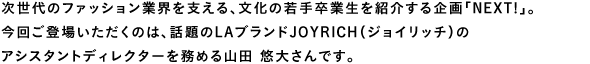 Freedom、Hope、Dream、Loveをコンセプトに、ポップでインパクトのあるアイテムを世に送り出しているLAブランド・ジョイリッチ。この9月には大阪と東京に新店舗がオープンし、おしゃれに敏感な人たちを中心に厚い支持を得ている。山田さんの担当業務は、日本の直営店のディレクションや、日本で独自に展開するアイテムの企画、提案。LAのスタッフとメールやスカイプ(インターネット電話)でコンタクトを取りながら、ブランドを日本に広く浸透させるために奔走している。「ブランドの知名度が上がってきた今、コレクションを発表するごとに大きな反響があります。正直プレッシャーを感じることもありますが、長谷川さん(vol.40に登場)の所属するギズモビーズとのコラボレーションで作成したiPhoneケースなど、ブランド戦略について考えるのは面白くやりがいがあります」