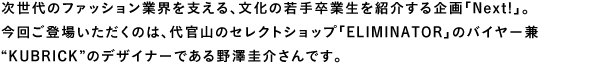 代官山のショップ「ELIMINATOR」のバイヤー・野澤圭介さんは、2011年秋冬にメンズブランド“KUBRICK”を立ち上げ、現在同ブランドのデザイナーとしても活動を開始したばかり。20代で学んだことや温め続けた服に対する想いが、30代になった今、ブランドを立ち上げる糧となった。立ち上げに際して、ここ数年の経済的な社会背景を心配し、友人から様々な忠告もあったが「逆にこういう時代だからこそやってみることで可能性というより、価値として残すことができるのではないかと思いスタートしました」と話す。