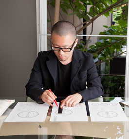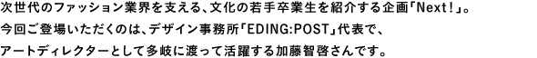 アートディレクターというと、一般的には手を動かさずに目に見える部分の指示を出す役割というイメージがあるが、加藤さんの場合は違っていて、企画の段階から携わり、最終的なデザインまでを一貫して担っている。そのジャンルは幅広く、アパレル事業だけでなく植物、花火、お米、コーヒー、パンケーキなど…実に多彩だ。起業したのは在学中の2007年。小さい頃から物作りに興味があり、美術系の高校で3年間アートを学んだという加藤さん。「文化に行ったからと言って服を作るという概念ではなくて。アパレルを身に着けたから出来ることがふくらんでいったという感覚です」。2年次に“服とプロダクトデザインの間”となるものを考案し、最初は1人でデザインし作ってみたのが始まりだった。