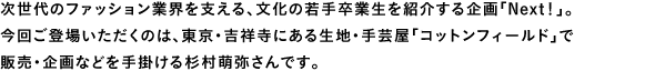 東京・吉祥寺にある「コットンフィールド」は、生地や洋装材料、アクセサリーパーツなどを取り扱う人気の手芸屋さん。そこで販売、仕入れ、企画を手掛ける杉村さんは、手作りを楽しむお客様へ喜んでもらえるような様々な提案をしています。「1日の仕事で多くの時間を費やすのは販売です。会社としては販売している人が一番売れるものを知っているというスタンスなので、販売と仕入れ担当を分けずに兼任しています」。そのため、国内外問わず商談や取引を重ね、海外へ買い付けに向かうことも多い。杉村さんは、お店の特徴でもあるUSAコットンの仕入れから、アクセサリーのパーツ、リボンなどの服飾資材に至るまでジャンルを問わず、すてきなものを見つけてきては仕入れをしている。