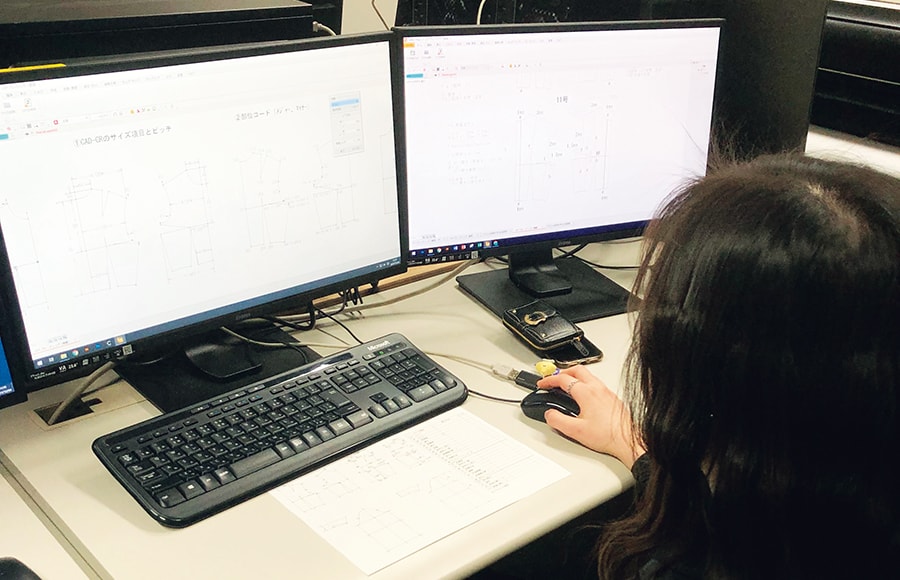 アパレルCADを利用したパターンメーキングの手法と展開方法を学び、工業設計の流れを理解します。量産技術実習科目と併せて、アパレル全体の生産システムについて学んでいきます。