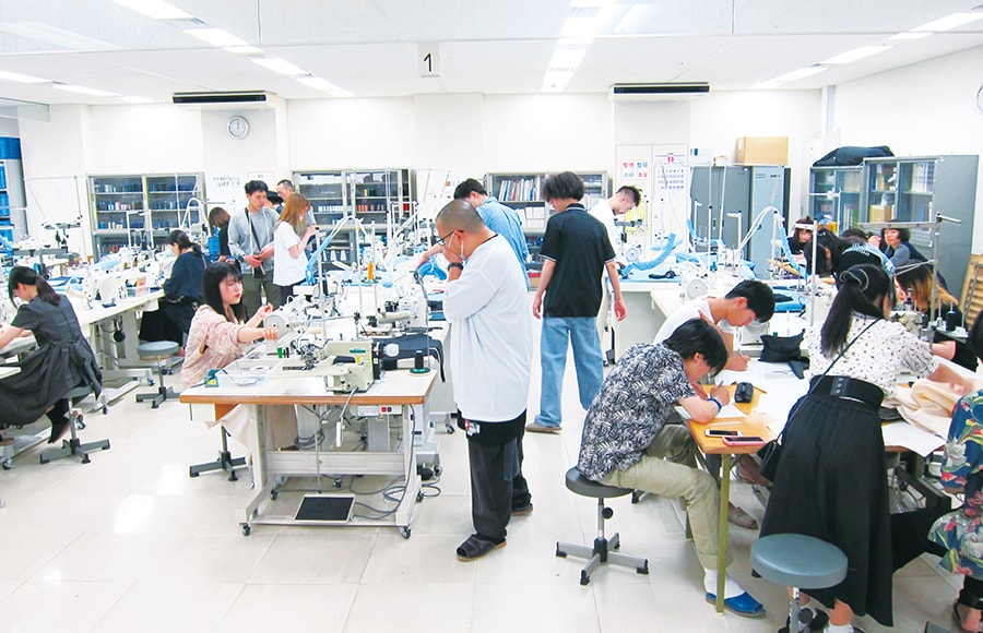 サンプルメーキングから、裁断工程、縫製、検品までの流れを、生産機器を使用しながらグループごとの分業で実習。アパレル産業の生産プロセスに基づき、製品の量産に必要な組織活動について学習します。