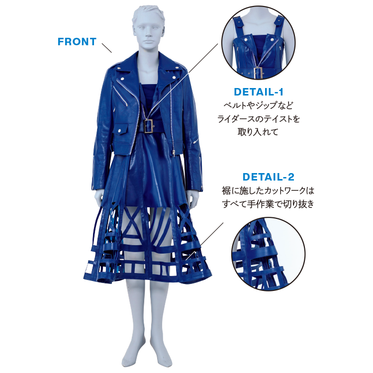 カウガールをイメージしたベスト。皮革だからこそのポイントとして、切りっぱなしのフリンジをデザインに取り入れました。大量のフリンジを、色と長さのバランスを考えながら配置するのは大変でしたが、作品が完成に近づいていくことに喜びを感じながら制作していました。