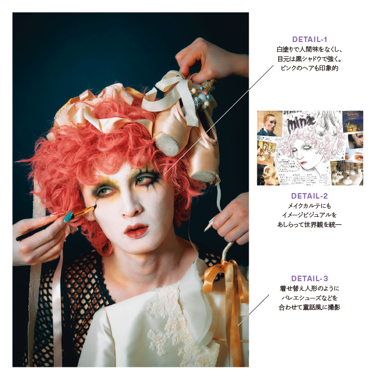 「脅威」の意味を持つラテン語の「minæ(ミナエ)」をテーマに、シャネルの 2022SS コレクションから「クラシック」と「クール」というキーワードに着想を得て表現。主に舞台用のメイク道具を使用し、クールさの中にも蠱惑的な魅力を持つ、エッジの効いたメイクアップに。