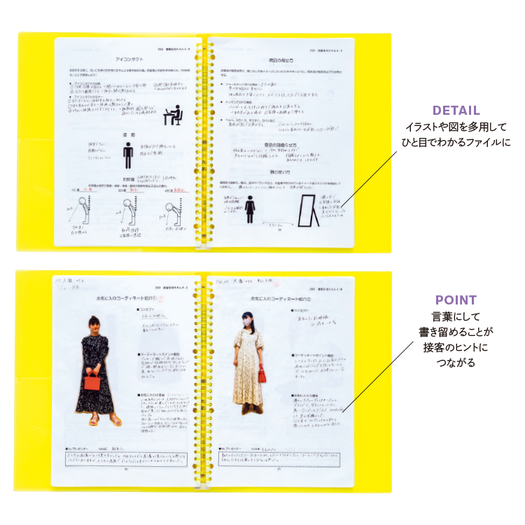 「接客対応スキル」の授業では、接客におけるマインドや言葉遣いなどに加え、自分なりに必要だと感じたポイントをノートに書き留めるようにしていました。ほかの人の目線で考えるという、ショップスタイリストとして大切なことに気づかされることがたくさんありました。