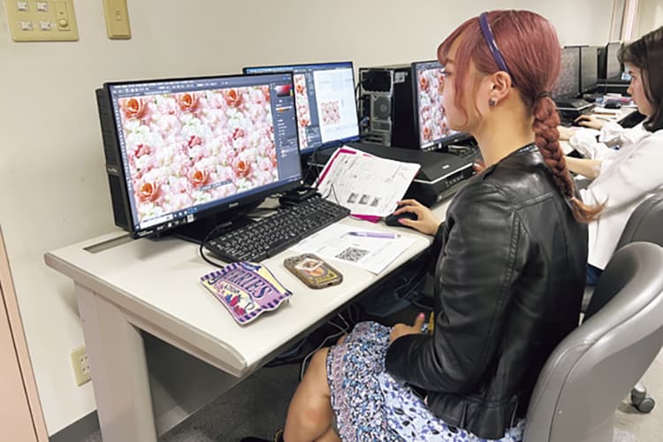 画像処理ソフトを利用し、テキスタイルデザインを学びます。連続柄の作成方法など、テキスタイル特有のデータづくりにも取り組み、デジタルテキスタイルプリンターを活用した布地制作を行います。