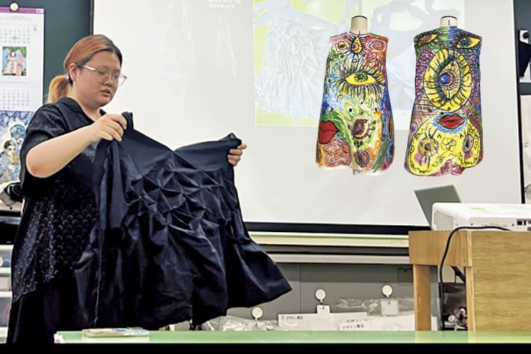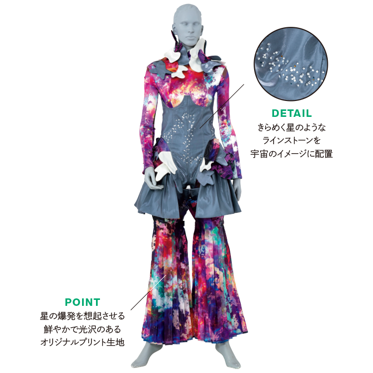 教科目「服装造形Ⅲ/カジュアルウェア」では、スポーツウェアのみならず、アパレルの商材の中で数多くのアイテムに使用されている伸縮素材についての知識と扱いを学び、作品を制作します。デジタルプリントをする等、学科とも連動してテクニックを磨きます。