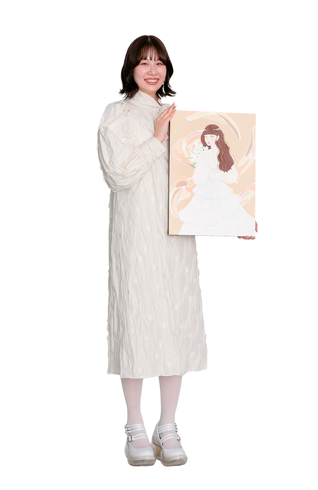 優しい色みや素材が好きで、洋服を通して、着る人や見る人に自分の思いが伝えられるような作品づくりを心がけています。卒業制作では「透光行」というテーマを掲げ、透明感やきらめきのある素材を選択。光の明度やコントラストを工夫し、軽やかさをまとった作品に仕上げました。