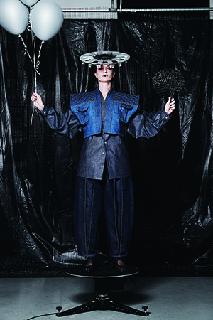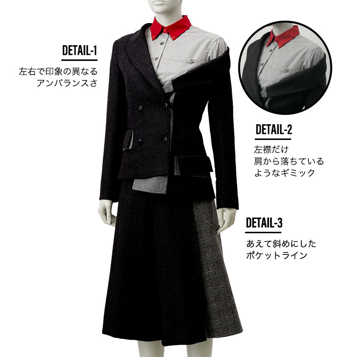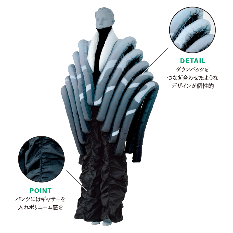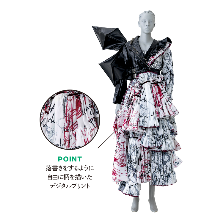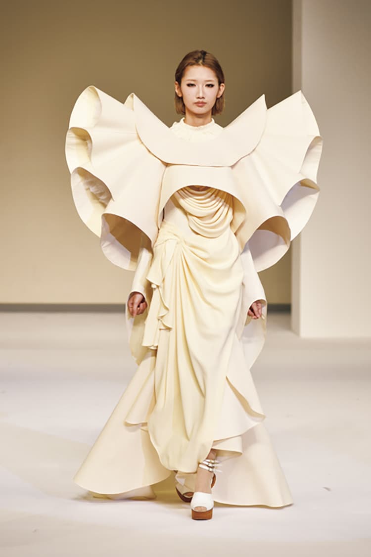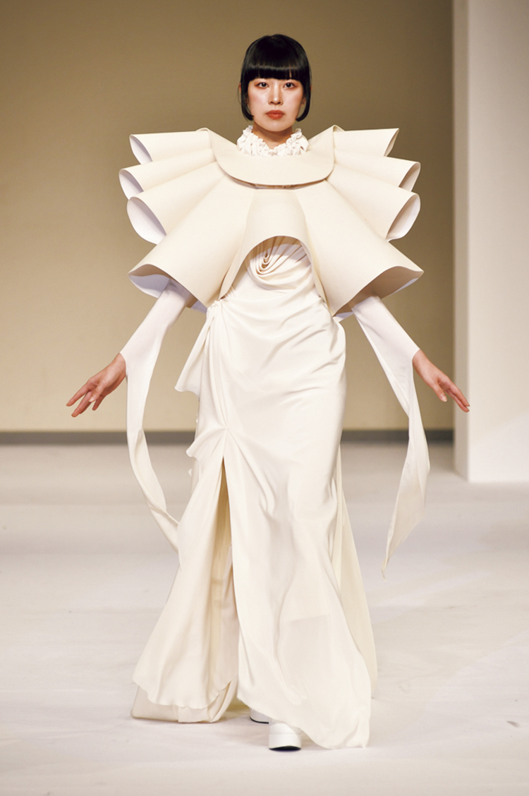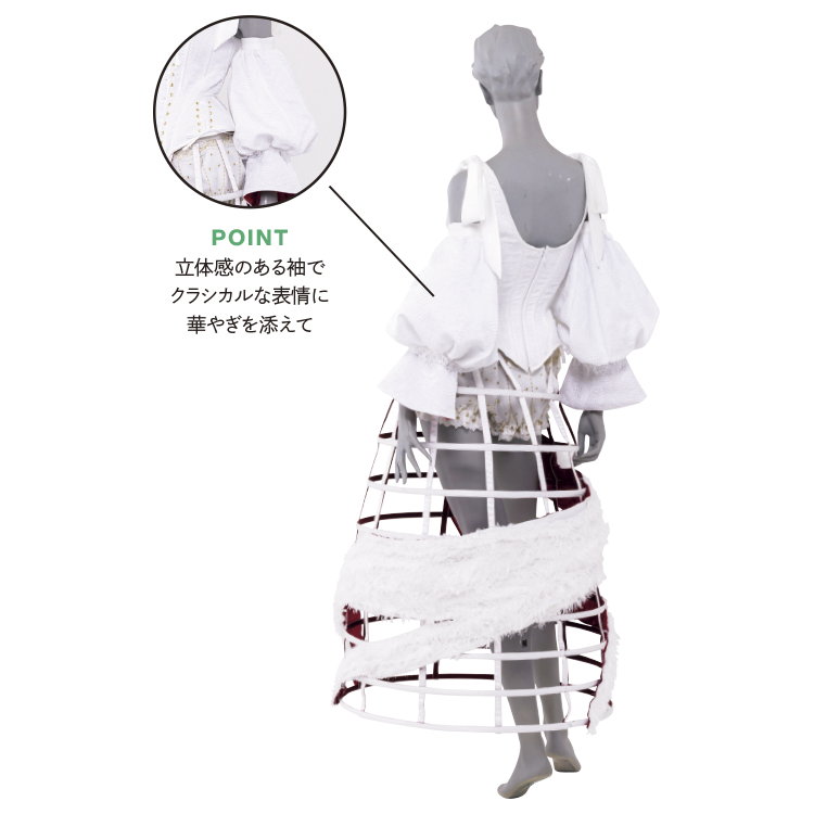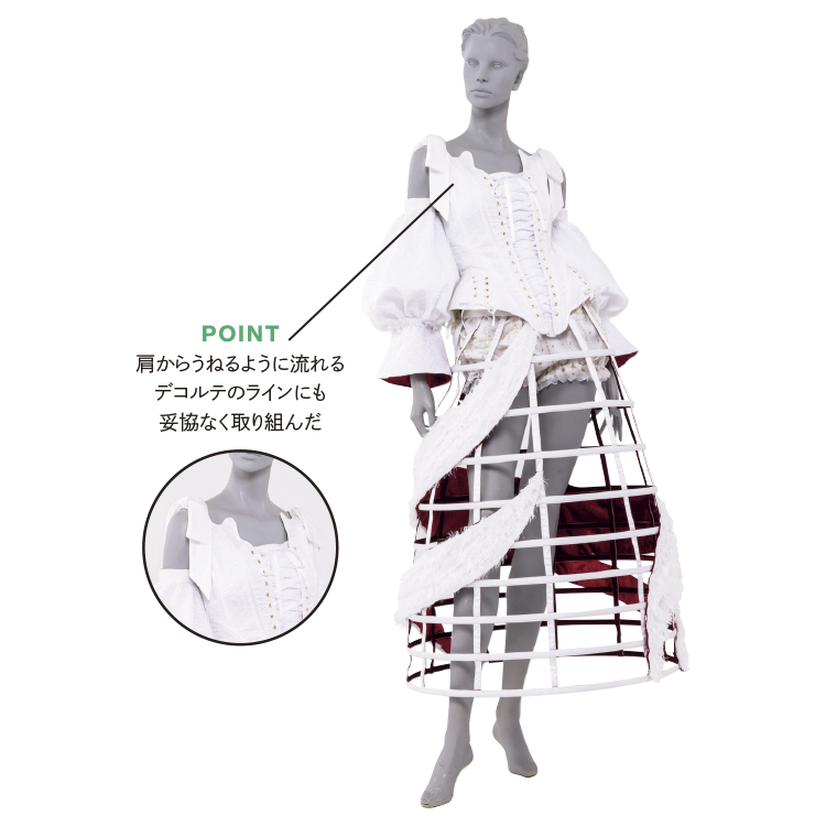 ヴィクトリア朝時代の下着であるコルセットやクリノリンなどにインスパイアされてデザインした作品は、クラシックとモダンを融合したドレス。昼に輝く星や雪に宿るきらめきをイメージしながら、幻想的な世界観を表現しました。こだわり抜いた白い素材使いの中にちらりと見える真紅の裏地がアクセントに。
