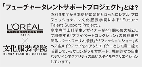 世界年間売上1位を誇る一大ビューティー企業であるロレアルグループ。その中核を担うヘアブランド「ロレアル プロフェッショナル」では若きクリエイターの育成を目的として、イギリスのセントラル・セント・マーチンズなど有名ファッションスクールの卒業ファッションショーや若手デザイナーのコレクションのhair&make-up Creationバックステージサポート企画を推進しています。日本では例年、スクール支援部門において文化服装学院を選出頂き、ファッション高度専門士科卒業ファッションショーにご協力頂いています。