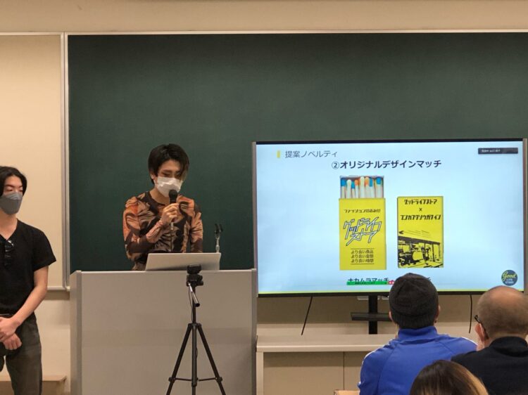 中山 修氏(Good LIFE STORE代表)同席のもと、スタートしたプレゼンテーションに参加したのは全9グループ。プレゼンテーションにかけられる持ち時間は各6分のため、短い中にも抑揚をつけ、また実物や動画を見せながら進行するなど、その発表にも工夫が凝らされていました。ショップのコンセプトや所在地、顧客層の分析を経て設定された商品の予算・納期はもちろん、ラッピング方法やそのグッズが顧客に手渡された先のストーリーまでが実にさまざまに提案されました。