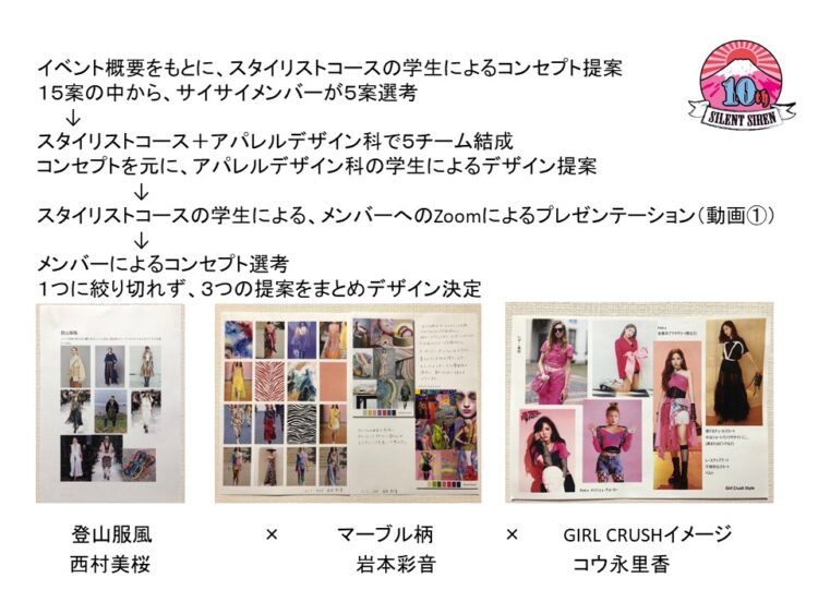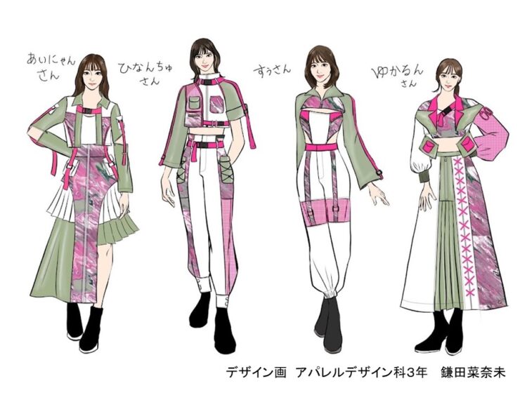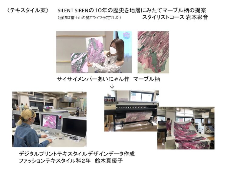 ライブ開催にあたり、結成10周年記念ライブ衣装のコンセプト提案をファッション流通科2年スタイリストコースの学生、衣装生地のプリントをファッションテキスタイル科の学生、衣装制作をアパレルデザイン科の学生が担当しました。
