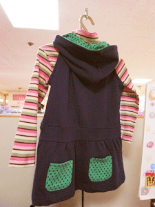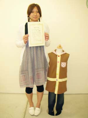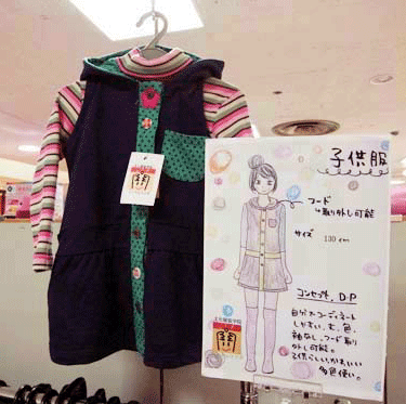 その中から、カラフルなボタン使いがかわいい子供服(ワンピース)が横浜高島屋で2009年2月11日~23日に販売。商品展開はネイビー×グリーンとダークブラン×ピンクの2種類。この商品企画を提案したのは服装科2年生の柴沙織さん。ご自分でもプレゼント用に購入したとか。単品でも魅力あるこのワンピースは売り場の注目商品だったようです。