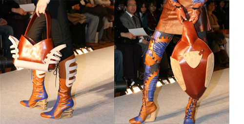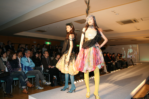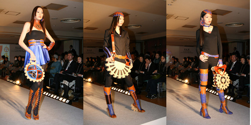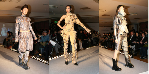 第79回を迎えた09-10秋冬コレクションは出展52社・7団体が参加し、開催されました。文化服装学院では東京レザーフェア関係各メーカーから提供された厳選素材、開発素材を使用し、資材連との共同作業によるオリジナル作品を製作。皮革の持つ高級感溢ある風合いと様々な表面加工などから新しいデザインの可能性やクリエイションを追求した作品が完成し、イベント両日にレザーファッションショーとして発表。今年は例年参加しているファッション工科専門課程アパレルデザイン科に加え、ファッション工芸専門課程が新たに参加し、帽子・ジュエリーデザイン科・バッグデザイン科・シューズデザイン科の学生がそれぞれの技術を活かした作品を制作し、発表しました。