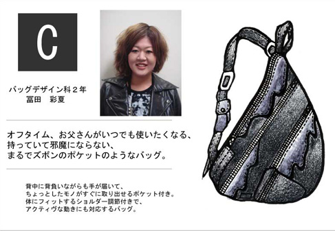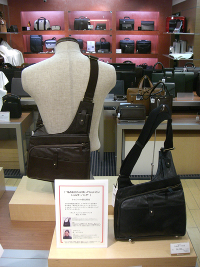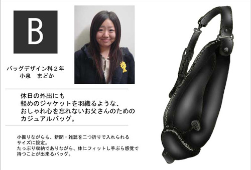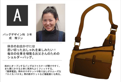 この企画は“わたしのお父さんに持ってもらいたいショルダーバッグ”というテーマのもと、学生がデザインを担当し、優秀作品3点をサンプル製作。サンプルを高島屋各店舗の紳士鞄売り場にて展示し、店頭アンケートの結果、最も評価が高い1点のデザインを商品化し、店頭販売するプロジェクトです。