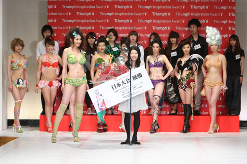 審査の結果、日本大会の優勝作品は黒巣幸乃さん(アパレルデザイン科)の「芽が出るインナー」が選ばれました。黒巣さんには日本大会優勝賞品として賞金の授与、世界大会開催地(ミラノ)への渡航費用が贈呈されるほか、2010年春夏商品としてこの作品が商品化される予定です。