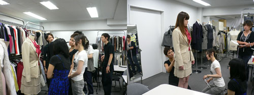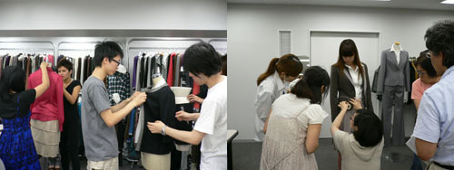 パターン作成、サンプルチェック、試着検討など、製品が実際に出来上がるまでのプロセスを実践的に学ぶ事の出来るコラボレーション企画なので学生たちの表情も真剣そのもの!