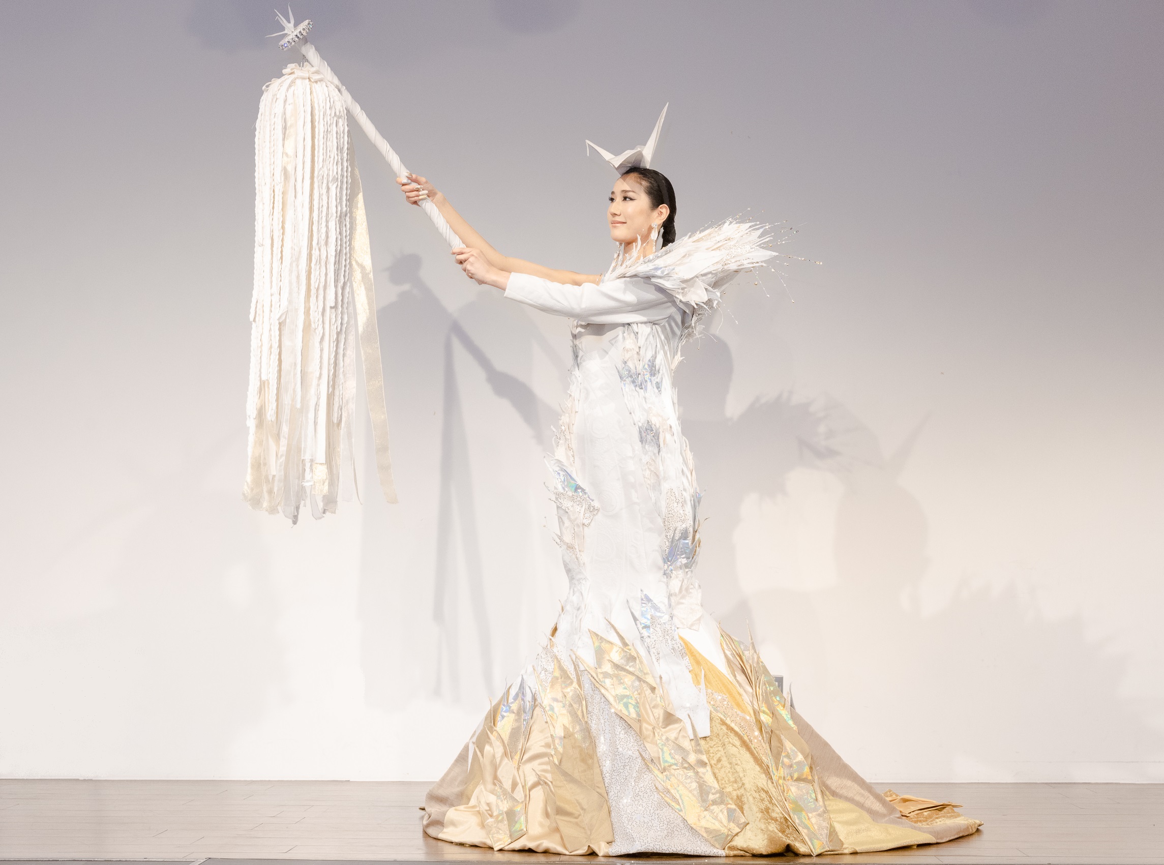 また、#senbazurujapan のプロジェクト活動によって日本全国の沢山の皆様に協力して折って来た2000羽以上の折り紙の鶴は千羽鶴をアレンジした神聖な杖、アクセサリーにも表現しています。
