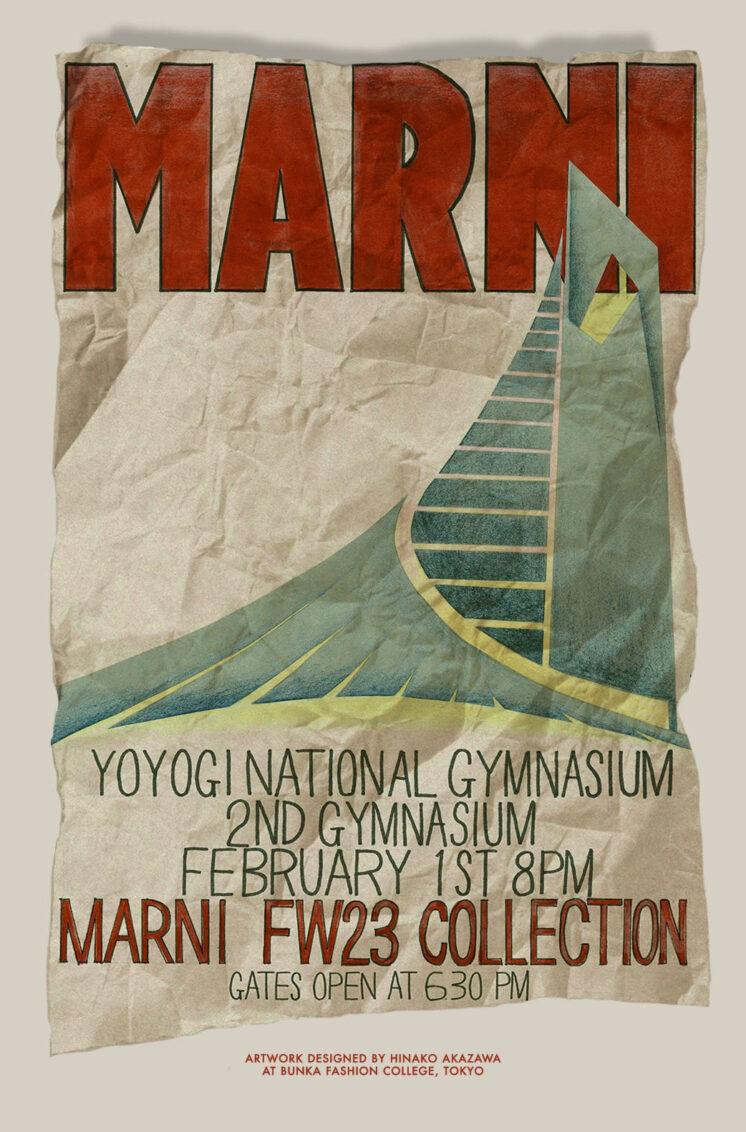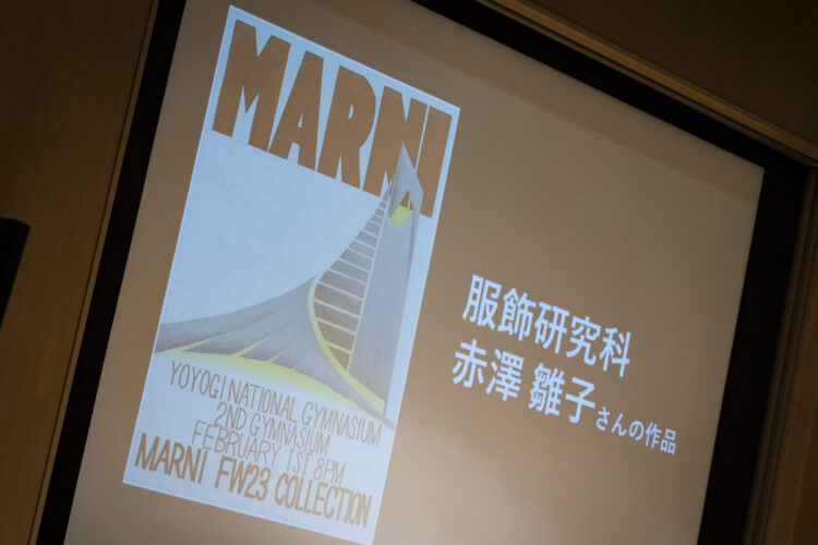 着る人をハッピーにさせるグラフィックや独特の色使いで人気のファッションブランド「MARNI(マルニ)」。日本で初めてとなる2月1日(水)のファッションショー開催にあわせ、文化服装学院の学生を対象に招待状デザインの募集が行われました。必要な文字情報、テーマを反映したアートワークが求められましたが、多くの学生が応募。採用されたのは赤澤 雛子さん(服飾研究科)の作品で、ほぼそのままのデザインが生かされ、招待客のみなさまの手に渡りました。