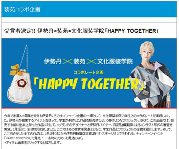 制作した商品は3月2日(水)より伊勢丹新宿店本館2階 ザ・ステージ#2で行われるキャンペーンイベント「HAPPY TOGETHER」にて販売されます。学生達にとっては商品を意識した作品制作の貴重な経験と第一線で活躍する有名デザイナーによるコンテストも兼ねたビッグイベントをぜひ会場でご覧下さい。