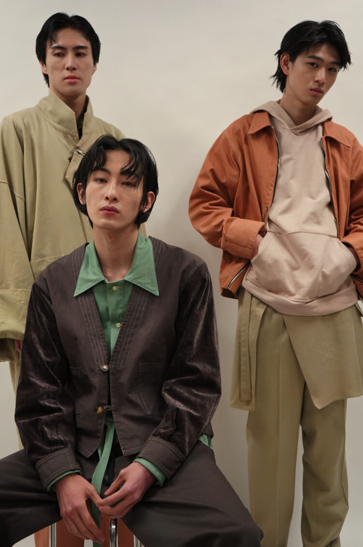 そこから導き出されたシーズンテーマは持続可能を再解釈した「持続可能な服を作る」というもの。サステナブルがトレンドと化している近年、持続可能性の意味の再解釈を行う必要があるのではないか、廃材を使うことや環境に配慮し続けるだけがサステナブルだろうか、その裏で失われかけている伝統工芸や技法を次世代に持続させていくことも、立派な サステナブルにならないだろうかと考えました。日本各地に点在、伝承された伝統工芸や技法を使うことによる持続可能な服づくりをしています。今回は伝統的な染色技法と和装の型紙(パターン)を応用、付加したコレクションとなっています。