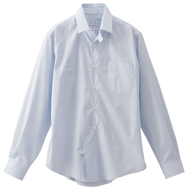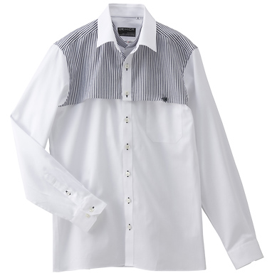 前立てを比翼仕立てにすることでスッキリとした印象に。また脇の部分を淡いグレーのプリント生地に切替えることで視覚的にも細身に見える効果があり、シャープで洗練された印象を与えてくれます。袖口は2つボタンのカフ仕上げのため、開閉調整やロールアップなども楽にできます。カジュアルには勿論、クールビズにも最適なシャツです。