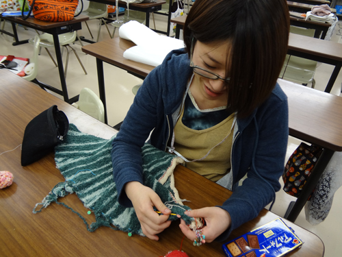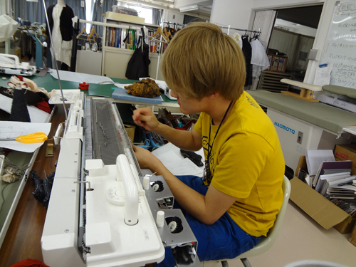 作品制作に必要なヤーンは、各学生のパートナー企業になったヤーンメーカーから提供されました。送られてきたヤーンの色や太さ、風合いに基づいてそれぞれの自由な発想でコンセプト及びデザインを決定し、手編みや家庭編み機、学校に設置されている最先端のニット生産機器などを駆使しながら約2ヶ月かけて制作しました。