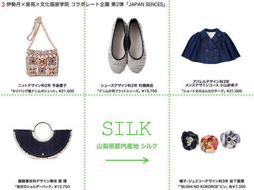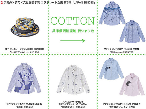 そして、4月よりスタートしている第二弾はテキスタイルの国産素材を使用することで「MADE IN JAPAN」の商品作りを体験してもらうことを目的に4つのテキスタイル産地から使用希望の素材を選択し、デザイン画を応募。伊勢丹バイヤー・装苑編集部の厳正なる審査を経て、通過学生は商品化に向けて制作。完成商品は伊勢丹新宿店にて9月7日(水)~13日(火)まで伊勢丹新宿店本館2階=ザ・ステージ#2にて販売されます。