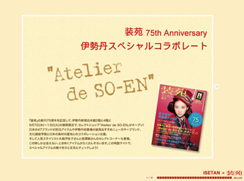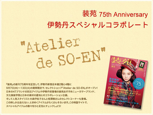 今年で創業125周年を迎える伊勢丹と常に時代を先駆けるファッション情報を消費者に伝えているファッション誌『装苑』の創刊75周年コラボレート企画として伊勢丹新宿店本館2階と4階に期間限定でセレクトショップ「Atelier de SO-EN」がオープン。