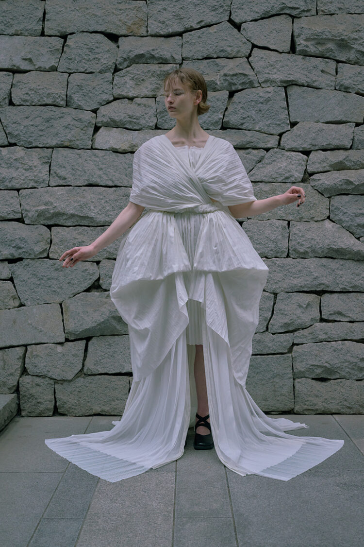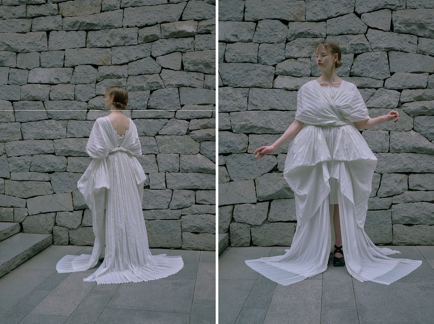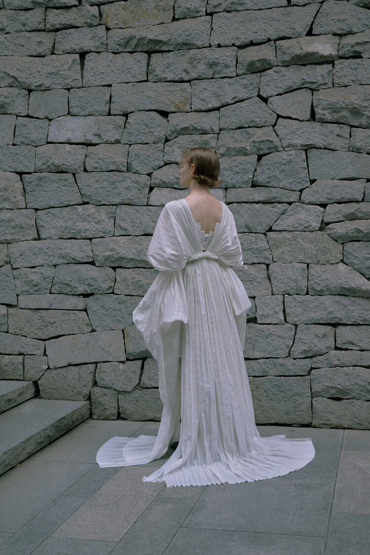 商品化された髙田 綾さんの作品は、「一生に一度しかない大切な時に着られるウェディングドレス、日常着とは違って誰もがお思いを込めて選びます。その素材がリサイクルで出来ていることに何の抵抗もなくなる位、リサイクルが浸透して欲しい」という作者の思いのこもった作品をベースとしています。 デザインの特徴でもあるプリーツは「山があるから谷があるように地球にあるものの存在意味」や「お互いがお互いを必要とすること」を表現しています。素材、デザインとも地球環境への思いが込められたウェディングドレスの ご提案となります。