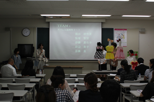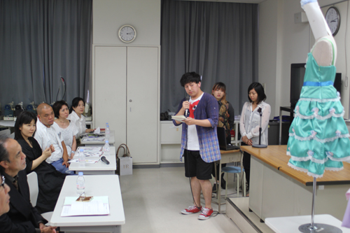▼完成した作品を指導頂いたワールドのデザイナー・パタンナーの方々に向けて、担当学生がプレゼンを行いました。今後の服作りにおける貴重なアドバイスなどを賜りました▼