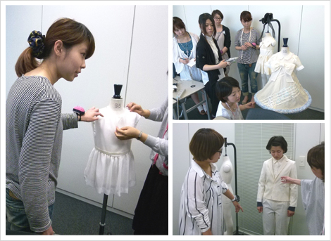 デザイン画をもとにアパレル技術科の学生がパターン作成~衣装製作を担当。ワールドのパタンナーによる子供服製作におけるレクチャーや指導などを受け、完成を目指します。