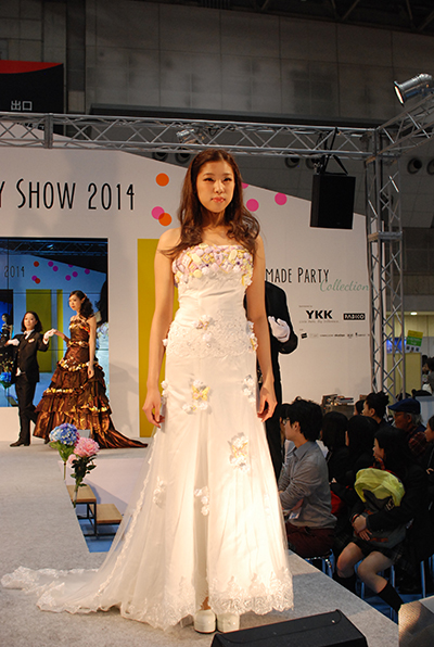 スイーツ王子こと、渡辺おさむさんと文化服装学院ファッション工芸専門課程の学生たちとのコラボ。世界初!スイーツデコWeddingドレスを有志学生が製作協力。モデルは流通課程内で選抜された学生が担当しました。