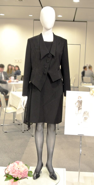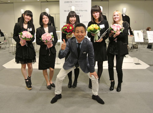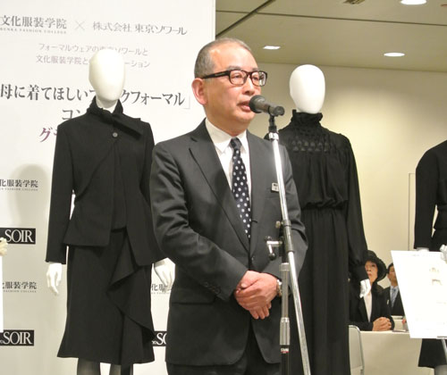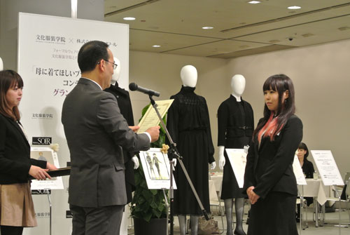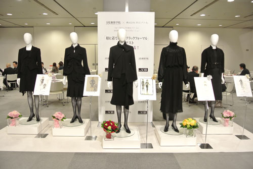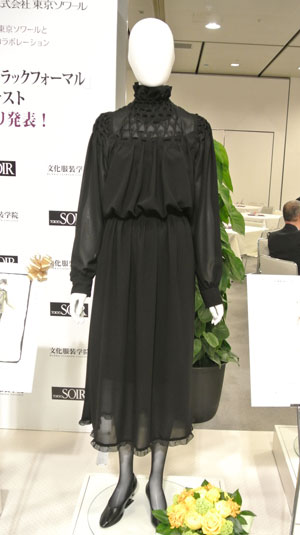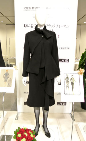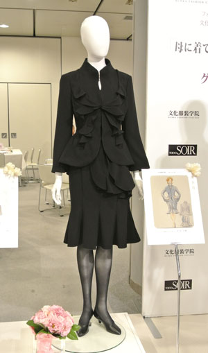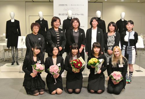 ブラックフォーマルを創造して45年目を迎える東京ソワールからのご提案企画で文化服装学院学生を対象とした「母に着てほしいブラックフォーマル」コンテストを実施頂きました。応募総数732作品の中からプレゼンテーション審査などを経て5名の学生デザイン案が選出され、現場で活躍するデザイナー・パタンナー指導の下、実物作品を完成させました。学生にとっては、実社会で活躍する方々に直接指導を受けることが出来るとても貴重な経験となりました。完成作品は東京ソワールの萩原会長を審査委員長とした東京ソワールの関係者及びゲスト審査員として文化服装学院出身の甲賀真理子氏、ナカ アキラ氏が招かれ、厳正な審査が行われ、5/23(金)の2014A/W展示会内で行われた表彰式にてグランプリ作品の他、各賞が発表されました。