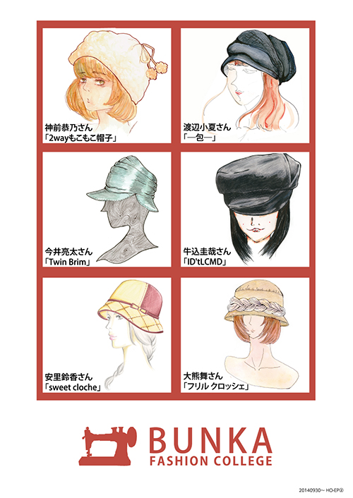 帽子・ジュエリーデザイン科の学生を対象に「初めての帽子」をテーマにデザインを募集。約190点の中から最終通過学生10名が製造を担当する帽子メーカー 株式会社栗原と素材や色・型など商品化に向けての打ち合わせを行い、数回のサンプルチェックを経て、商品が完成しました。